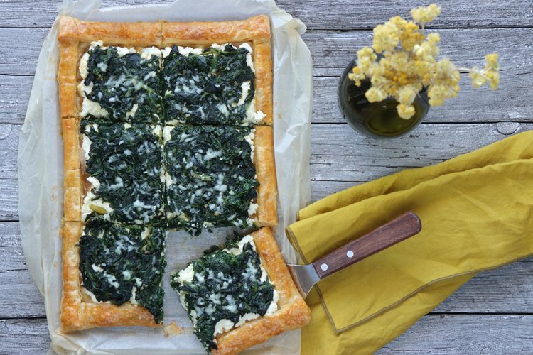 Μεσογειακή τάρτα με σπανάκι, φέτα, καραμελωμένα κρεμμύδια και αφράτη, τραγανή σφολιάτα, γεμίζουν το στόμα νοστιμιά.